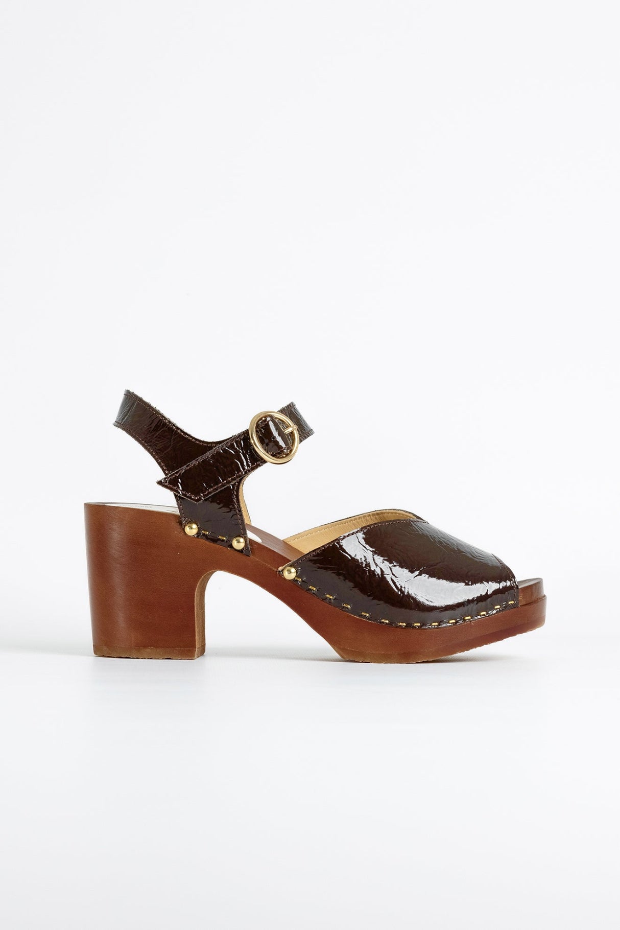 Fabriqué en cuir de vachette pleine fleur à tannage végétal et doublé de cuir pleine fleur, il offre souplesse, brillance et confort. Sa semelle en bois de tilleul ciré, légère et isolante, épouse la forme du pied tout en affirmant un caractère authentique. Orné de 12 clous dorés posés à la main et d’une fine bride cheville à boucle ronde, le YADOR VERNIS CHOCO séduit par son allure rétro-chic, à la fois féminine et affirmée.