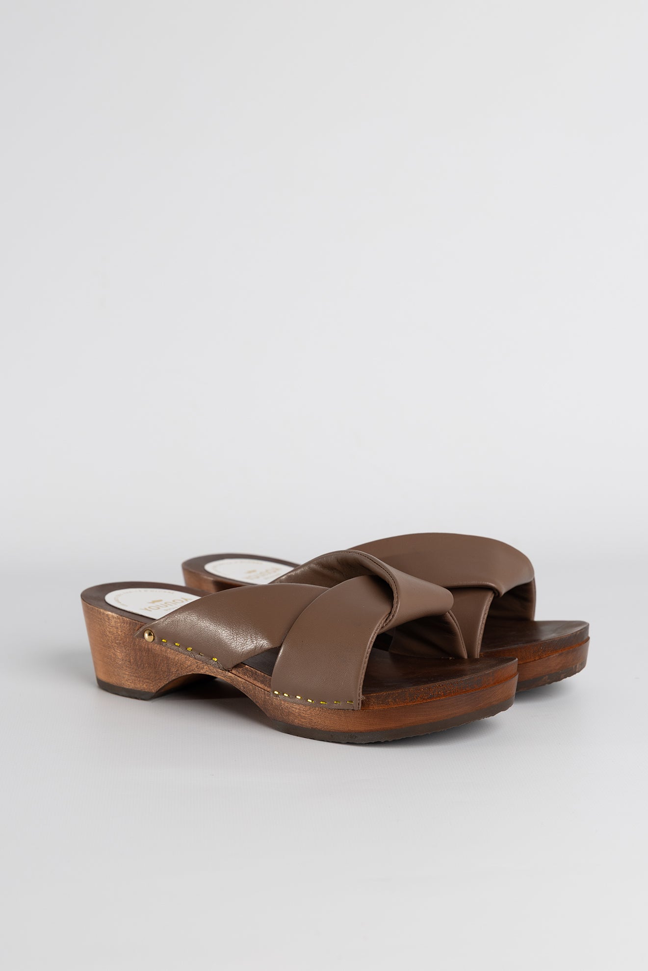 Le YAPI SOFT BRUN incarne une vision contemporaine du sabot mule, où la douceur des matières rencontre une esthétique épurée et inspirée. Confectionné en cuir de métis pleine fleur, doublé de cuir de veau pleine fleur, il se distingue par ses deux larges lanières entrecroisées qui dessinent un drapé fluide et enveloppent délicatement le cou-de-pied. Sa teinte brun profond souligne la richesse du cuir et apporte une élégance naturelle, facile à associer au quotidien. La semelle en bois de tilleul, légère et stable, repose sur un talon de 4,5 cm offrant un confort idéal tout au long de la journée. Orné de 4 clous dorés semi-bombés posés à la main, ce sabot révèle un savoir-faire artisanal précis et une allure subtilement japonisante, à la fois minimaliste et affirmée.
