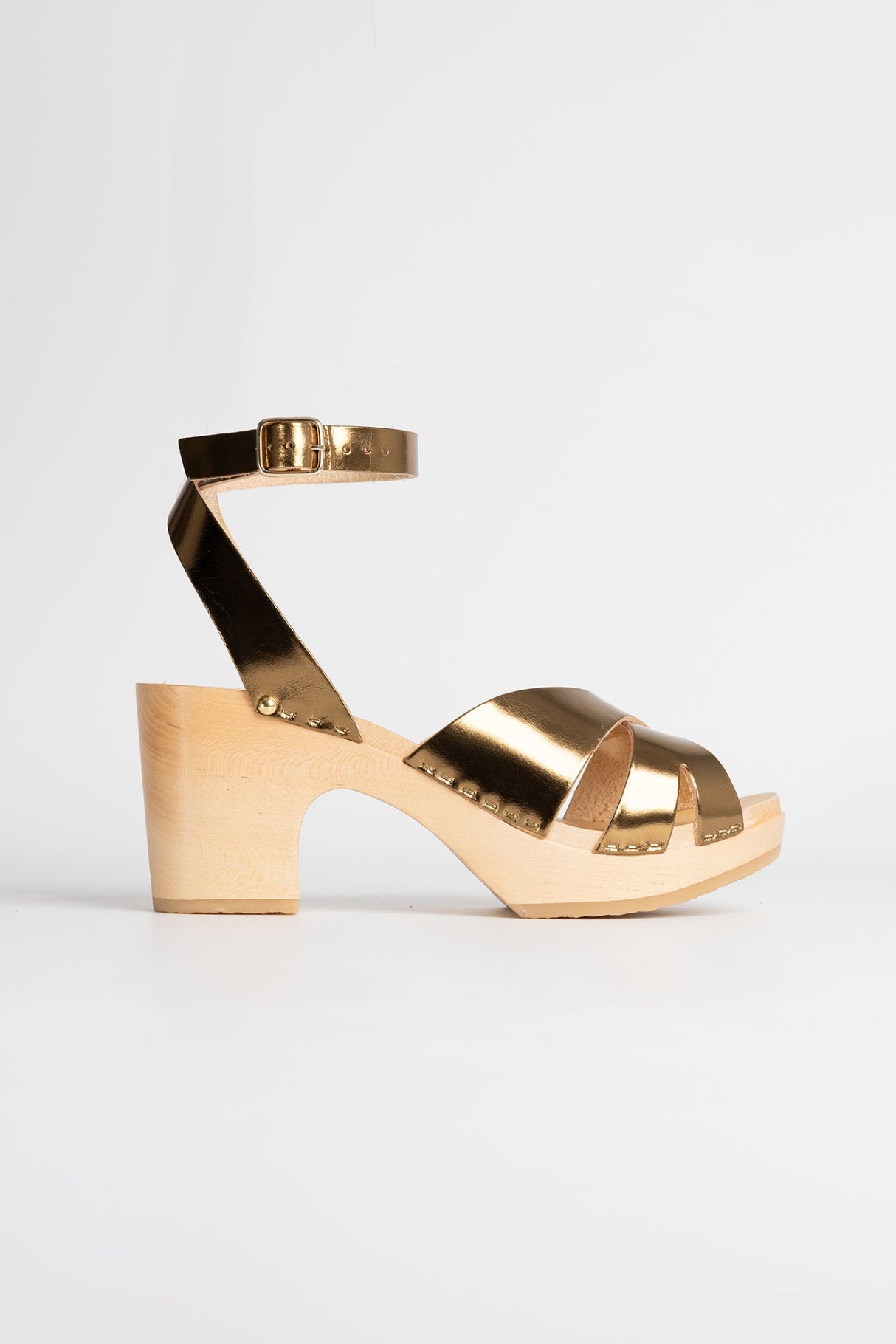 La bride cheville se ferme à l'aide d'une fine boucle rectangulaire dorée.