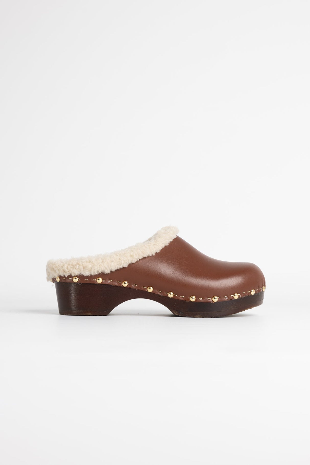 Confectionné en cuir de vachette pleine fleur à tannage végétal, il se pare d’une semelle en bois de tilleul ciré, légère et isolante. Sa doublure en laine naturelle offre un cocon de chaleur, tandis que ses 46 clous dorés, posés un à un à la main, rappellent l’artisanat précieux de la marque.