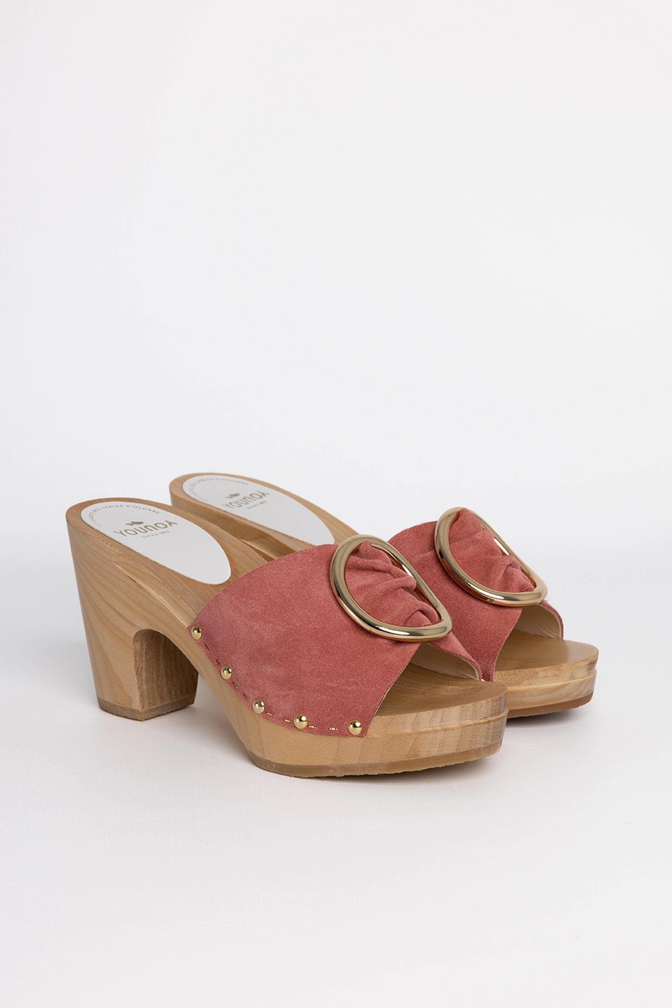Les sabots mules YEYE VELVET, fabriqués en croûte de vachette velours, sont composés d'une large lanière relevée par une jolie boucle dorée donnant un effet drapé.