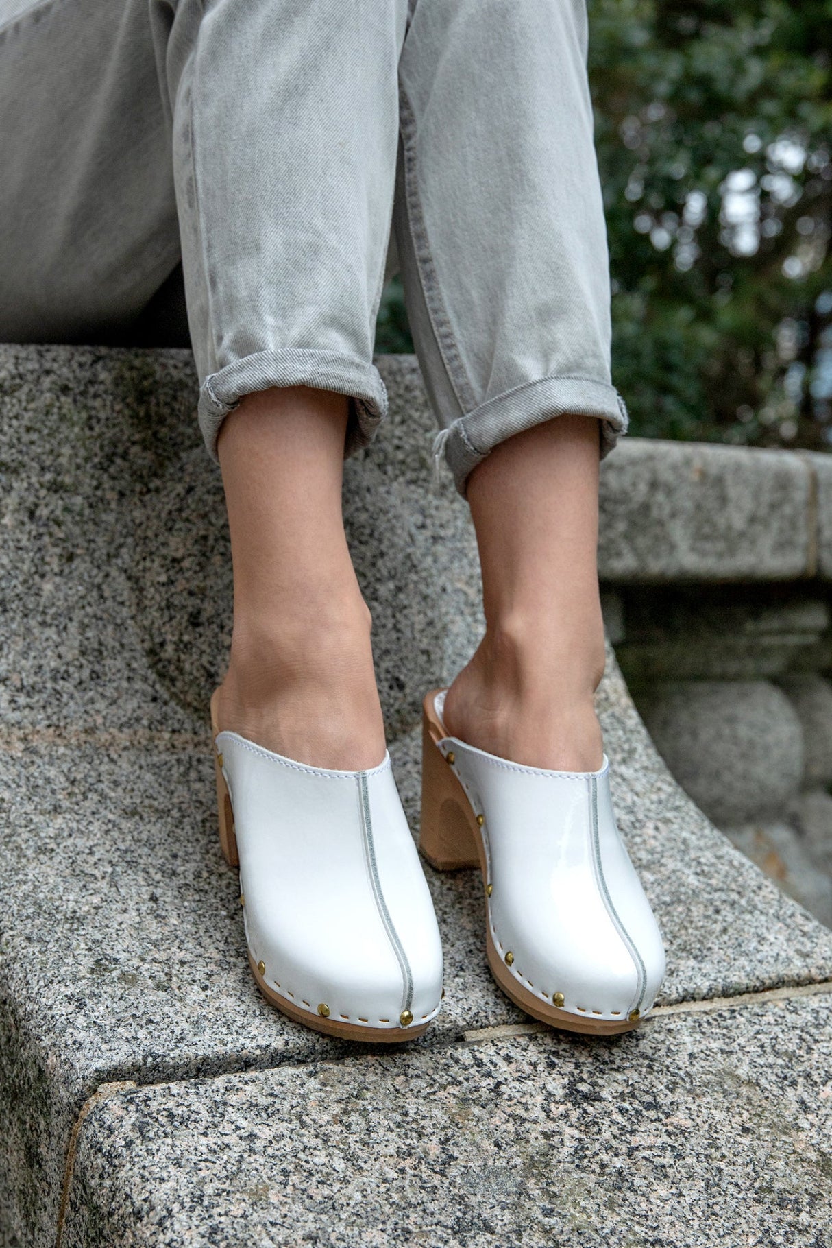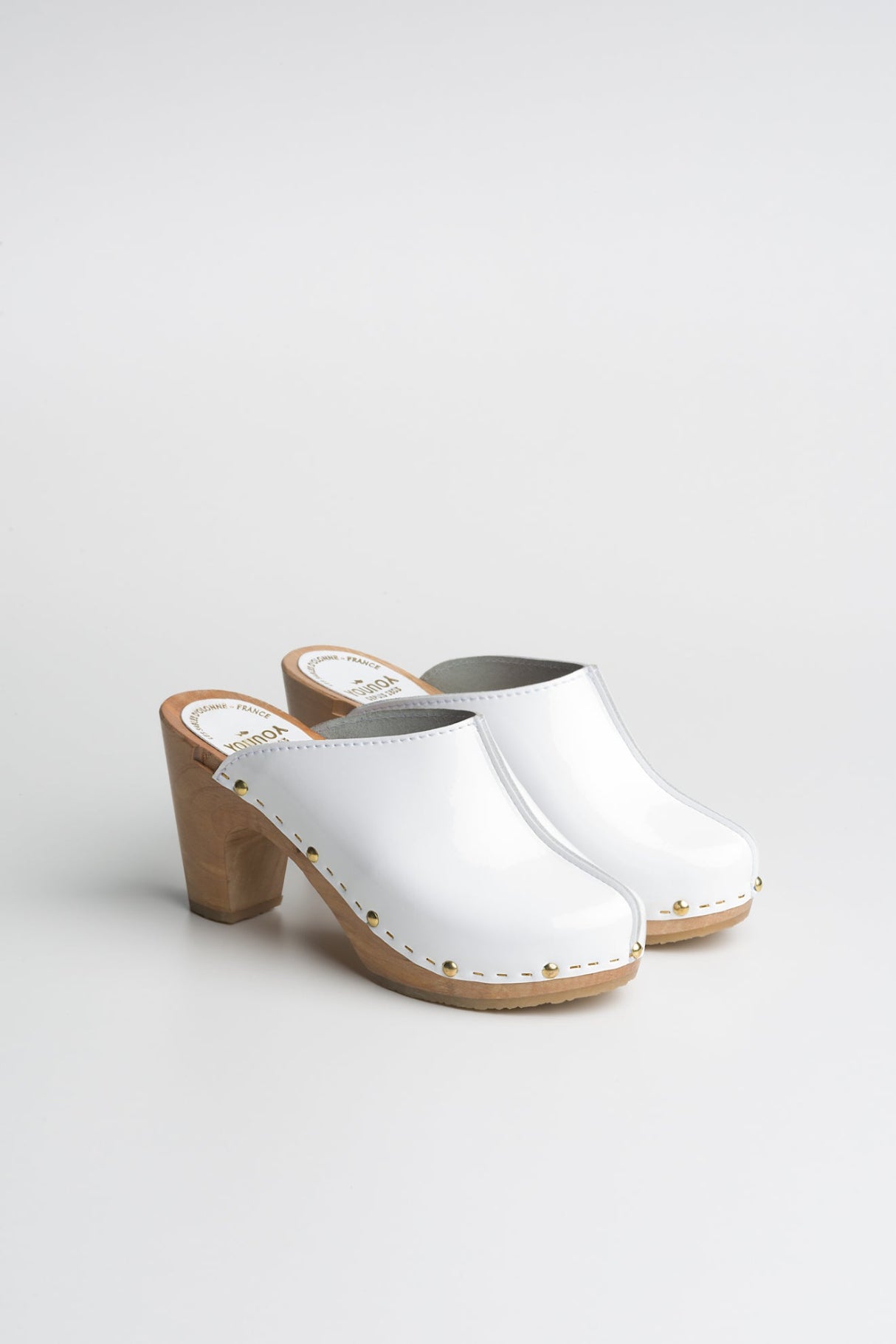 Les sabots YLONA VERNIS, fabriqués en cuir de vachette pleine fleur à tannage végétal, sont relevés d'une jolie couture inversée sur le dessus.