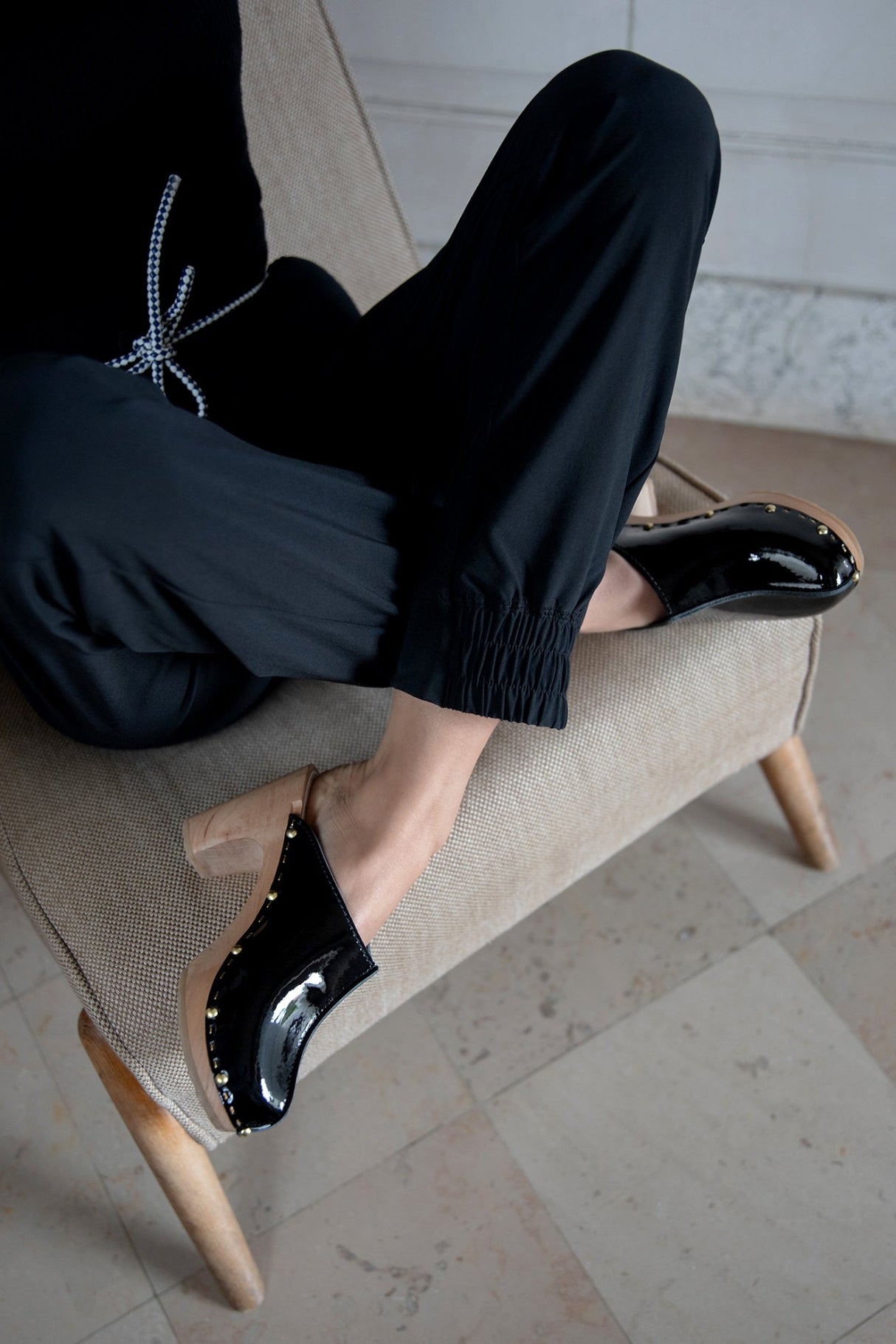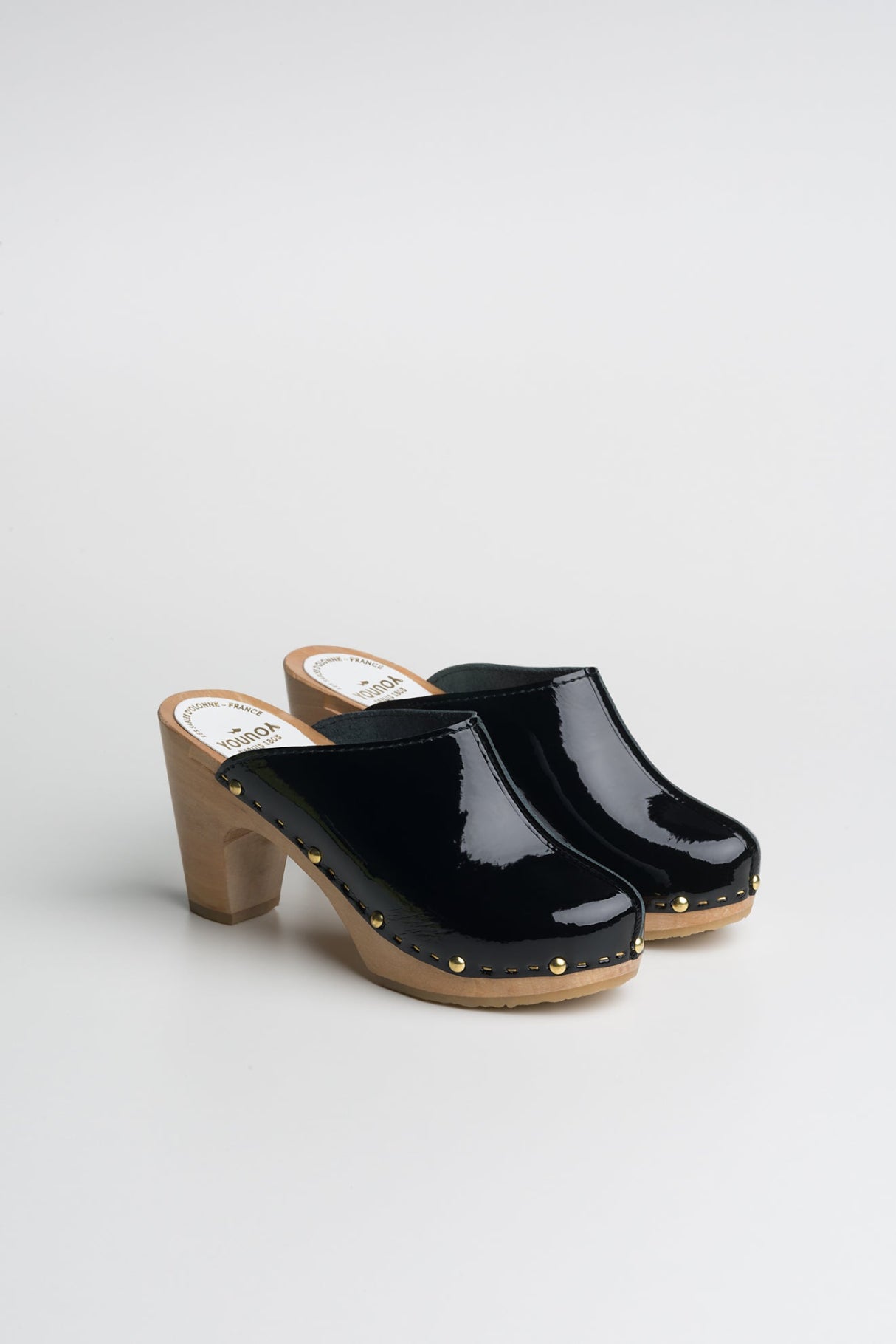 Les sabots YLONA VERNIS, fabriqués en cuir de vachette pleine fleur à tannage végétal, sont relevés d'une jolie couture inversée sur le dessus.