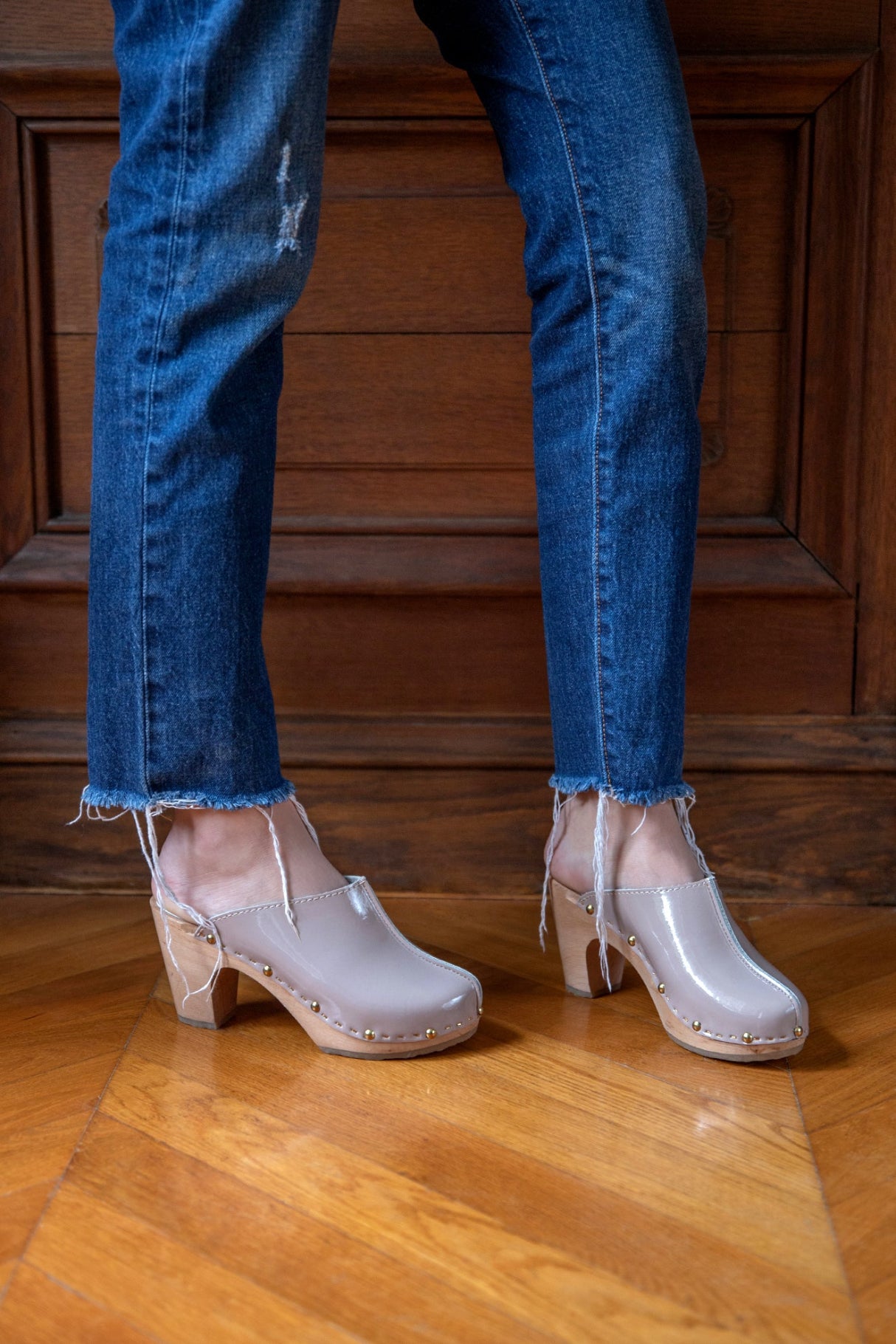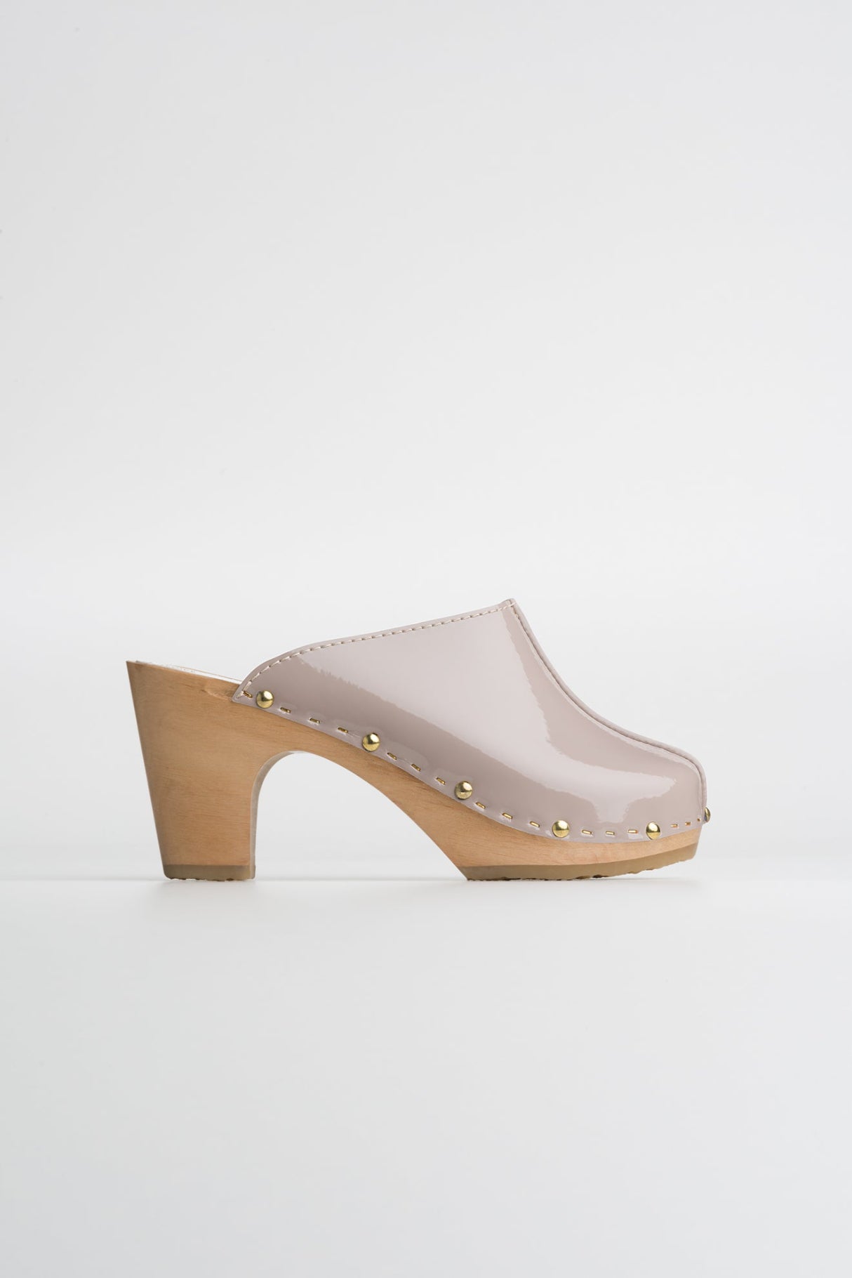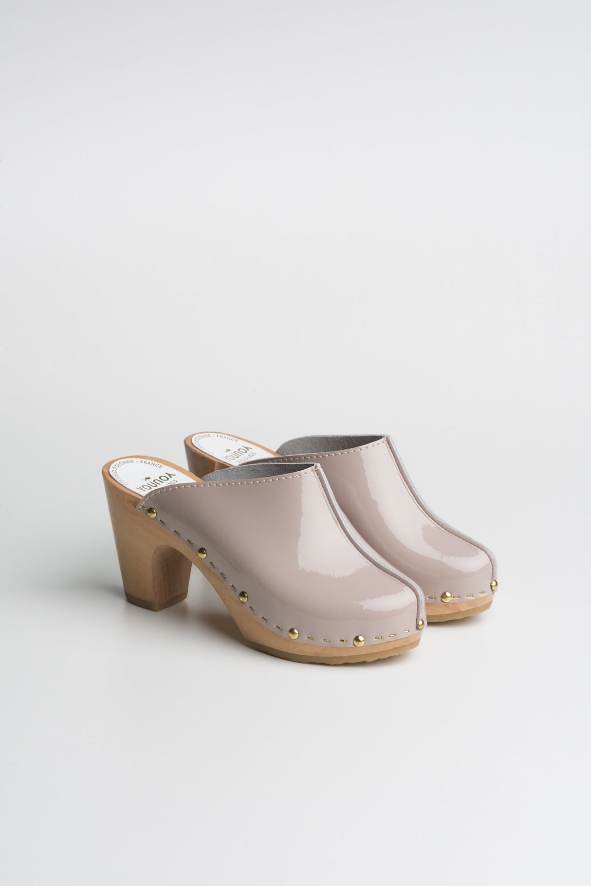 Les sabots YLONA VERNIS, fabriqués en cuir de vachette pleine fleur à tannage végétal, sont relevés d'une jolie couture inversée sur le dessus.