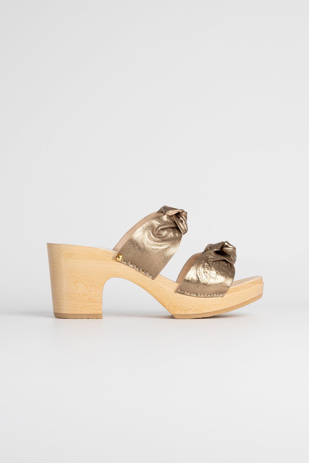 Les sabots mules YNOUI LAMINATO, fabriqués en cuir de vachette pleine fleur à tannage végétal, sont composés de deux lanières relevées par de jolis noeuds et enveloppant le pied pour un maintien parfait.