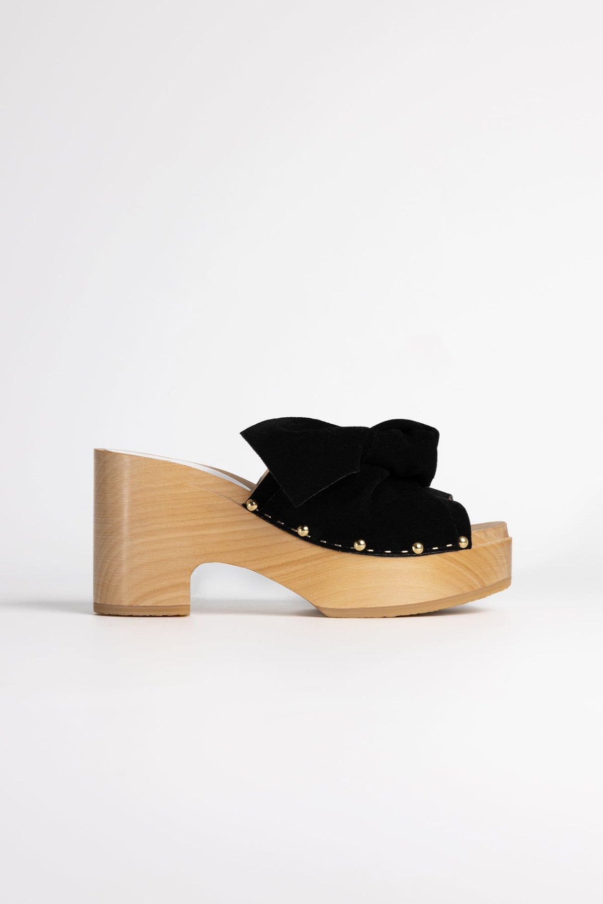Cette belle paire à talon compensé de 8,5 cm est ornée de 20 clous semi-bombés dorés et posés à la main.