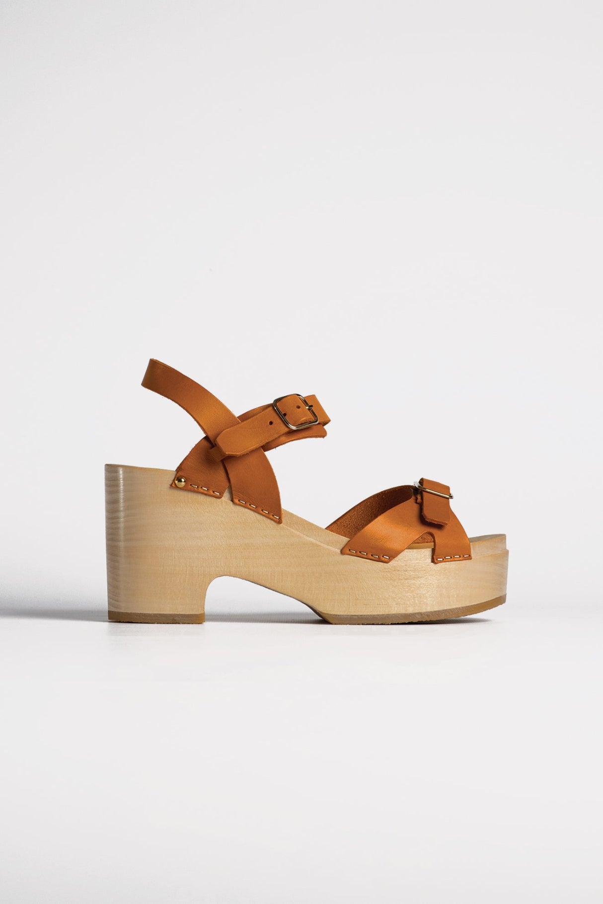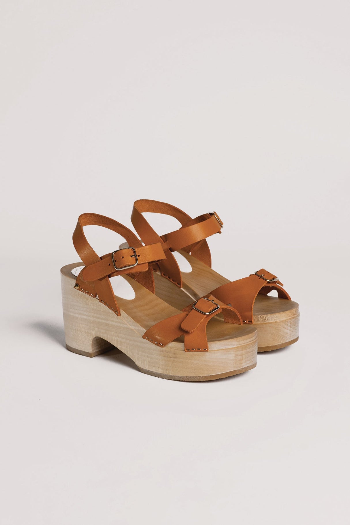 Les sabots sandales YRIS, fabriqués en cuir de vachette pleine fleur à tannage végétal, sont relevés par un joli jeu de lanières croisées pour un maintien parfait.