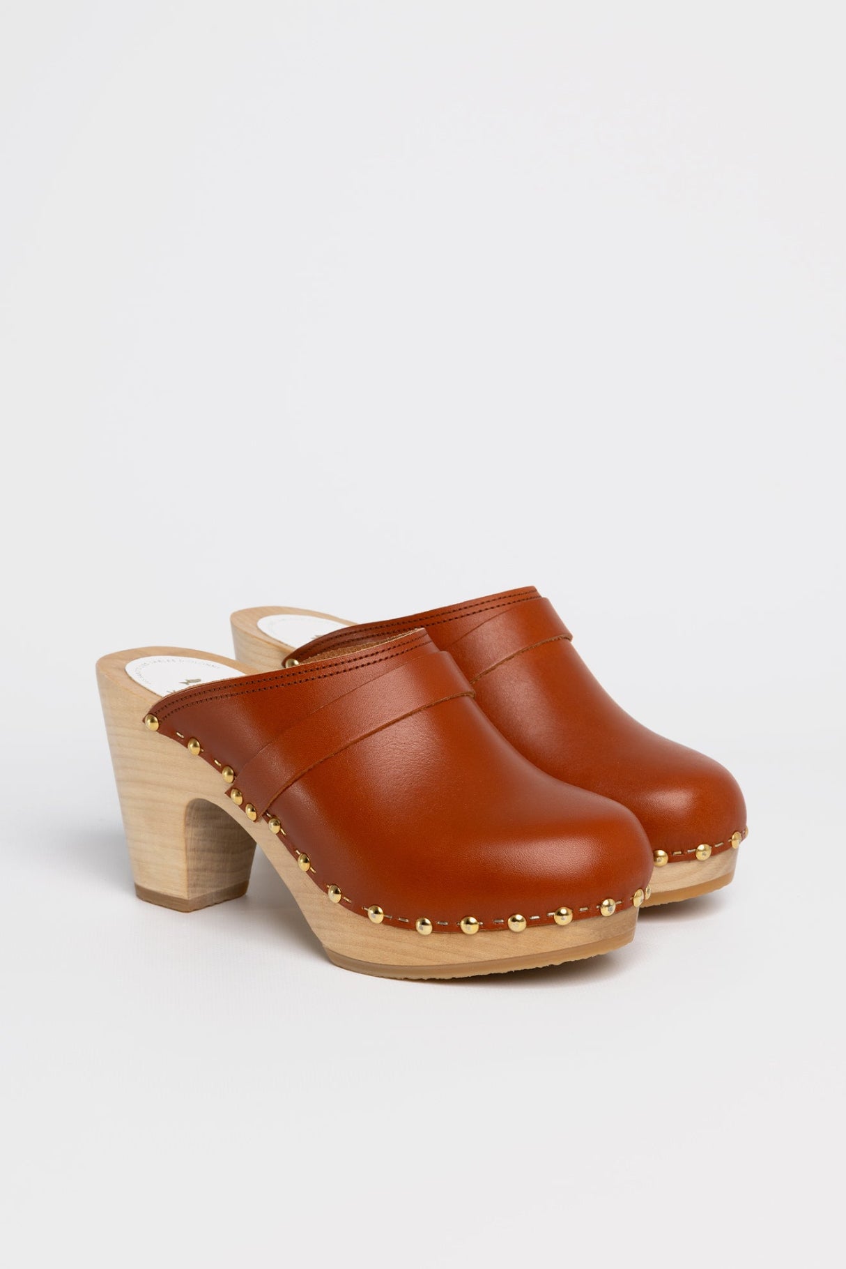 Les sabots YRMA ROCK, fabriqués en cuir de vachette pleine fleur à tannage végétal, sont relevés d'une bride de cuir sur le dessus.