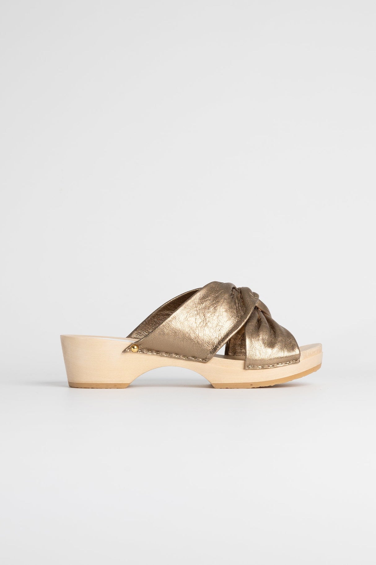 Les sabots mules YURI LAMINATO, fabriqués en cuir de métis pleine fleur doublé de veau pleine fleur, sont composés de deux larges lanières entrecroisées formant un drapé et enveloppant le coup de pied pour un maintien parfait.