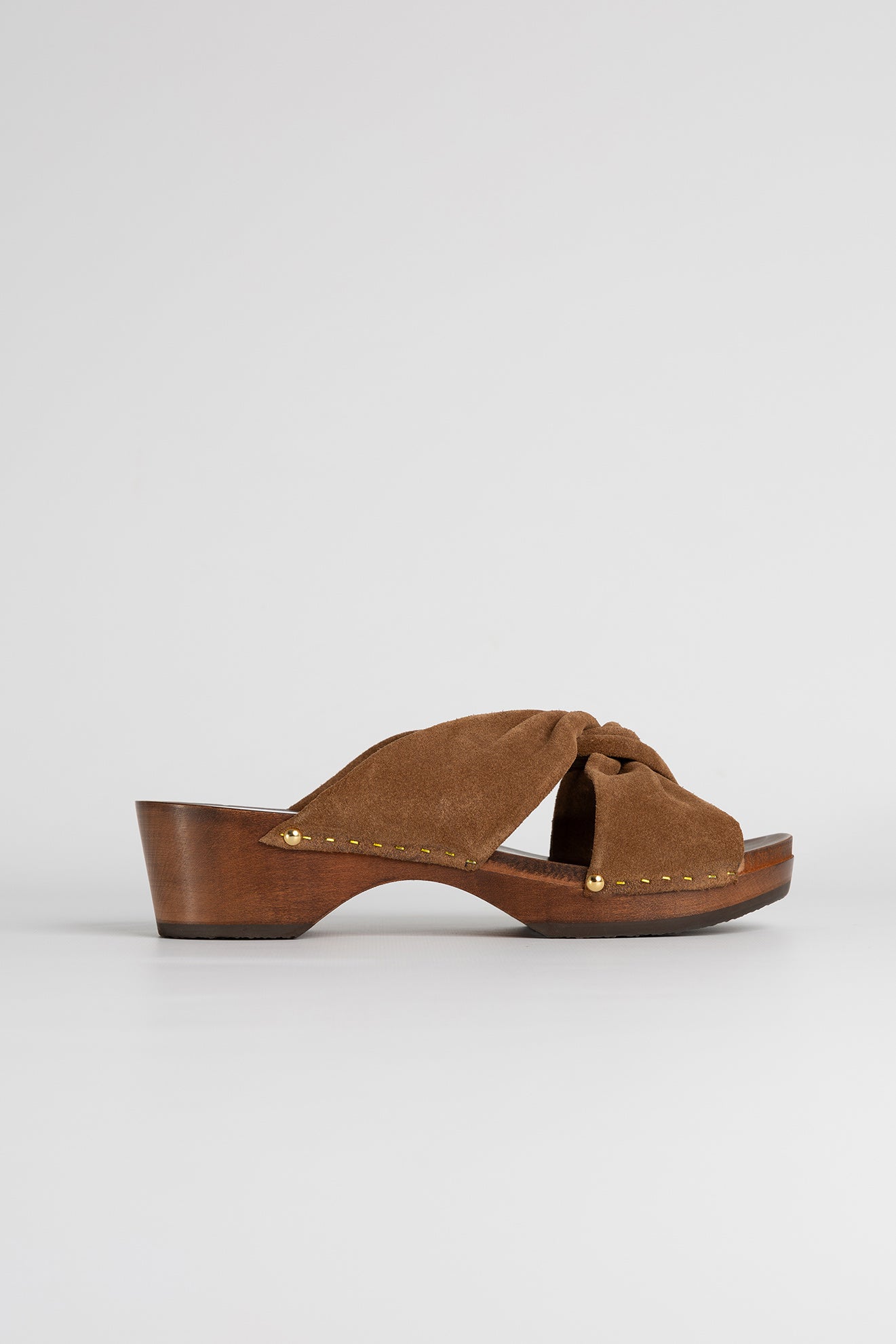 Le YURI VELVET BRUN s’inscrit dans une esthétique chaleureuse et authentique, où la matière guide le geste. Sa croûte de vachette velours, profonde et enveloppante, se travaille en larges bandes croisées, dessinant un nœud souple qui structure le dessus du pied avec naturel. Ce sabot mule repose sur une semelle en bois de tilleul, reconnue pour sa légèreté et son confort au quotidien. Le talon de 4,5 cm accompagne la marche avec stabilité, tandis que les clous dorés posés à la main soulignent la ligne avec discrétion. Une création au caractère doux et affirmé, pensée pour traverser l’été avec allure et liberté, fidèle à l’esprit artisanal de YOUYOU.